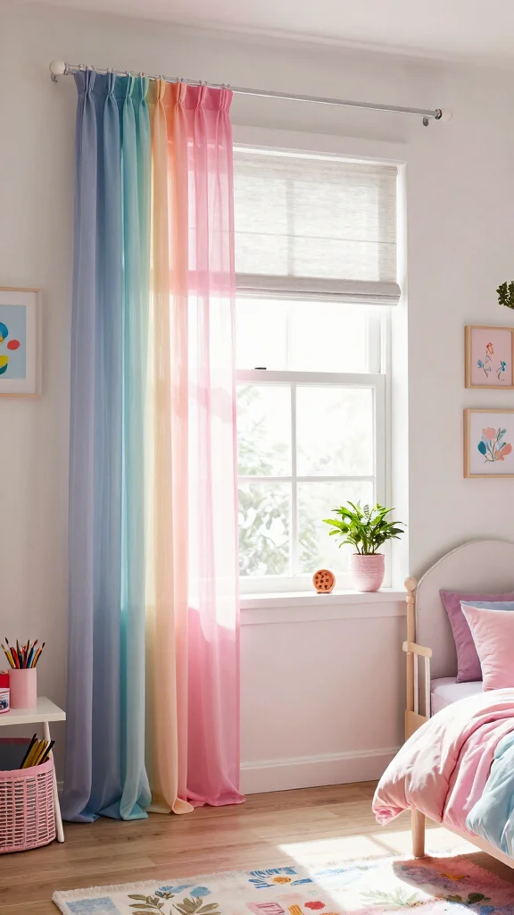 Brighten her space with cheerful rainbow-striped curtains that instantly uplift the room’s ambiance. These vibrant drapes can transform any bedroom into a joyful haven, perfect for a young girl looking to express herself. Rainbow stripes can be both playful and stylish, easily matched with accessories and bedding in similar color schemes for a cohesive look.