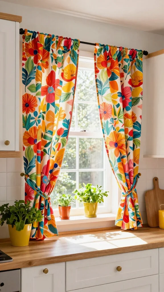 To energize your kitchen, opt for bright and colorful curtains that can transform the entire space. Made from natural fabrics like organic cotton or hemp, these curtains align with sustainable practices while making a bold statement. Choose vibrant prints or solid colors that contrast beautifully with neutral cabinetry and countertops, creating a lively atmosphere.