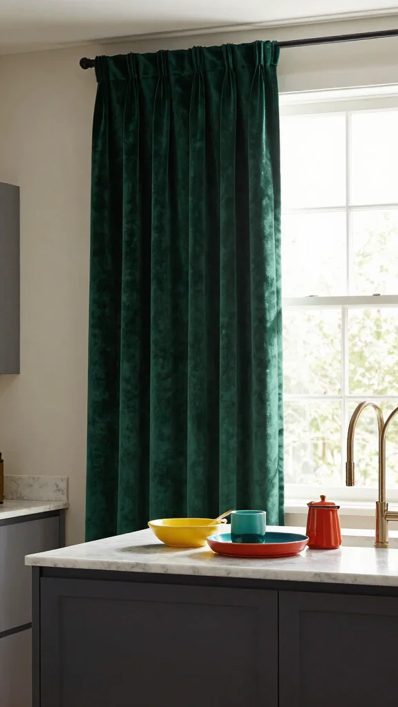 Choose deep jewel tones like emerald or royal blue for a striking contrast against lighter kitchen elements, making a bold style statement. Velvet drapes can easily elevate the overall atmosphere of your cooking space.