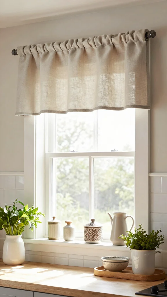 Go with light, sheer kitchen curtains to maximize natural light and create a sense of airiness. Short or cafe-style kitchen valances can add charm without making the window look crowded. If you love farmhouse window decor, choose neutral tones and breathable fabrics that pair well with wooden accents. Measure carefully and hang curtains higher than the window to create the illusion of additional height. Consider coordinating with decorative window shades for versatility in light control, all while keeping the look sustainable and bright.