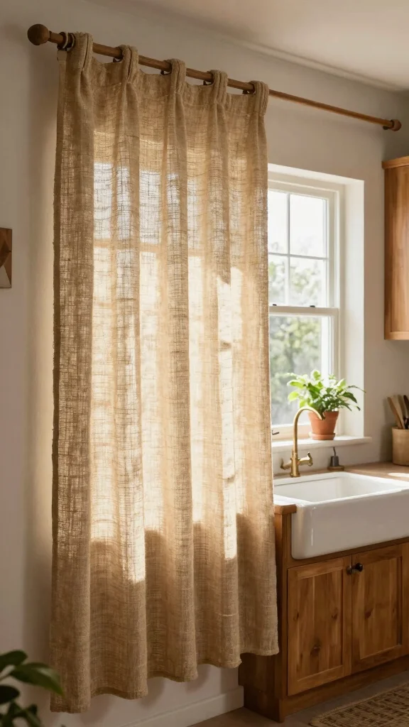 Jute curtains bring rustic charm and eco-friendliness to your kitchen, adding a warm touch to your decor. Known for their durability and organic texture, jute curtains create a welcoming vibe perfect for bohemian or farmhouse aesthetics. Available in various weaves, from light and airy to heavier styles, they can soften the room beautifully.