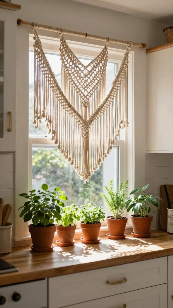 Pair macrame with sheer fabrics for a layered effect that adds depth to your windows. Incorporating plants alongside these hangings creates a lively, natural feel, making your kitchen a bright and inviting space.