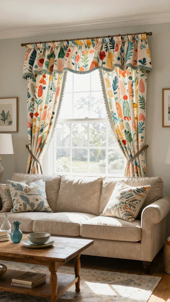 Elevate your windows with patterned valances that bring vibrancy to your living room. Valances provide a decorative layer while allowing natural light to filter into your space. Made from various eco-friendly fabrics, they’re a sustainable choice that adds a pop of color.