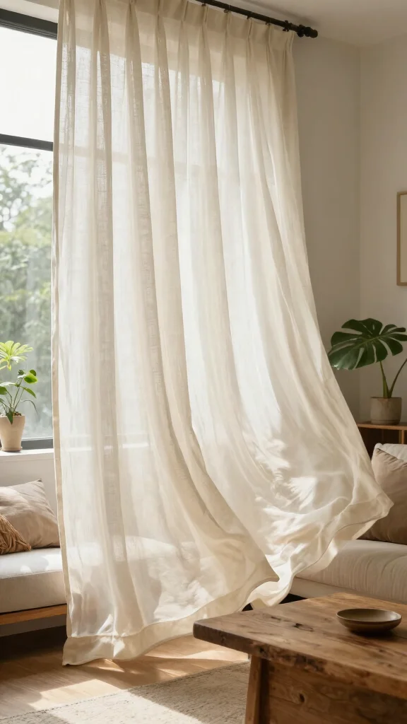 Layering is key. Use sheer curtains for living room near the window combined with light-filtering shades or modern window blinds for privacy while keeping sunlight soft.