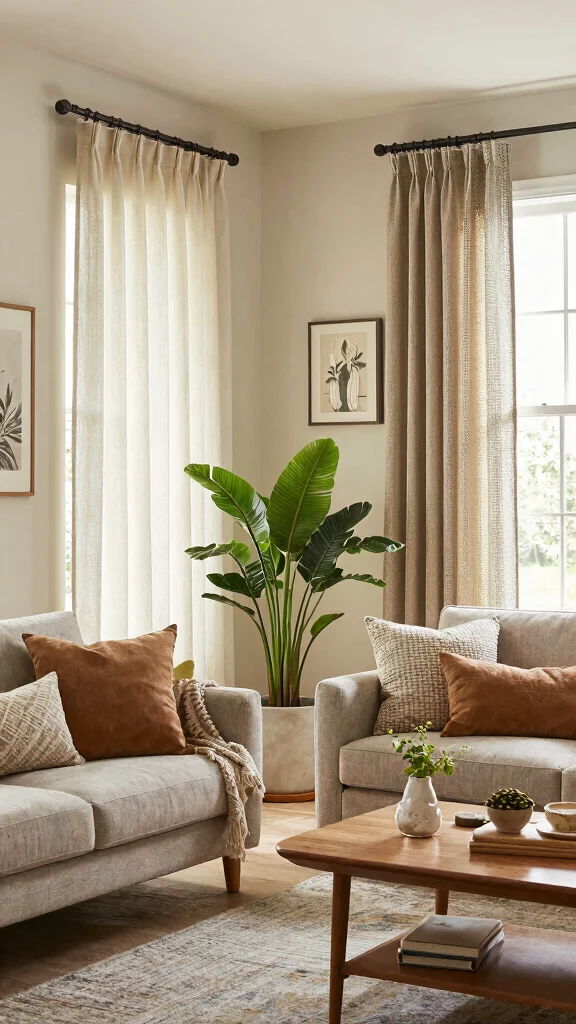 Light-filtering shades are my go-to window treatments living room upgrade—privacy without blocking sunshine. Choose bamboo or linen, then layer with curtains for an eco-friendly vibe that makes every afternoon feel cozier.