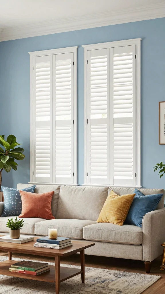 – Install shutters or roller shades in neutral tones to blend with walls and reduce visual clutter.