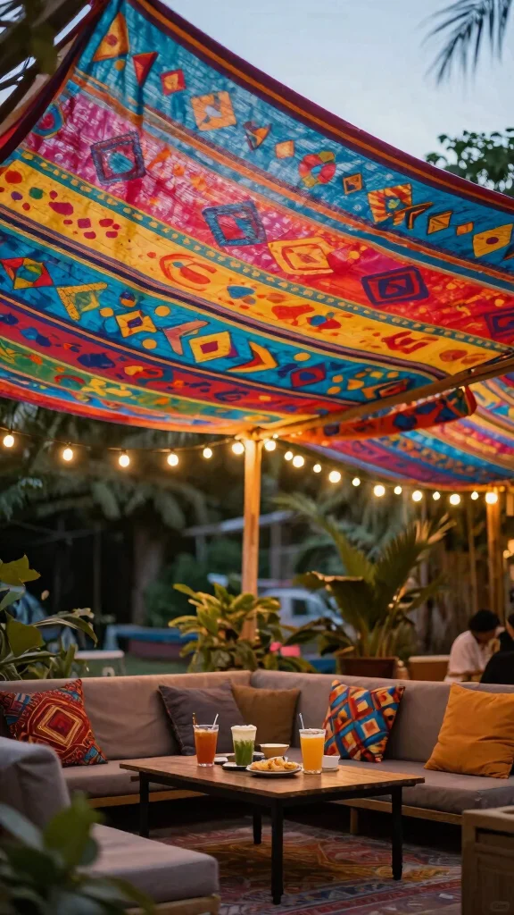 Add an artsy fabric canopy for a creative touch that enhances both style and outdoor enjoyment.