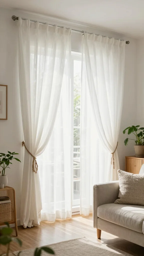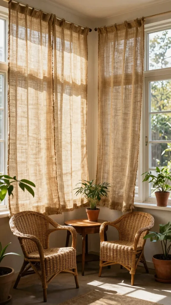 Opt for breathable natural fabrics that filter light beautifully: linen, cotton, or linen-cotton blends. These natural fabric drapes create a soft glow. Sheer burlap-linen blends offer rustic texture without blocking too much light. Avoid heavy velvet or dark fabrics if you want bright rooms. Pair light fabrics with light colors like oatmeal, cream, or warm gray to keep the space airy.