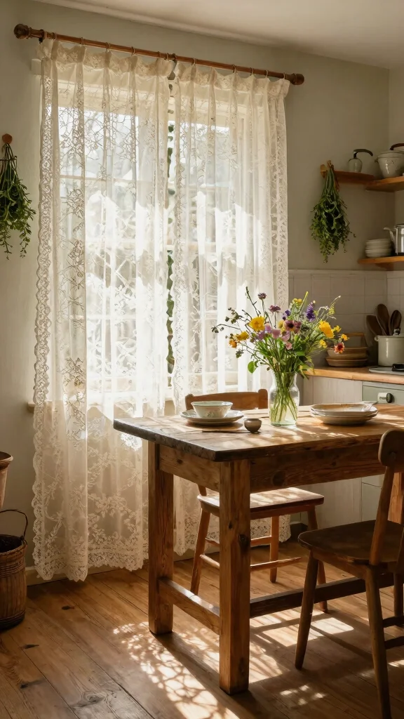 For a touch of romance, vintage lace curtains are an excellent choice.