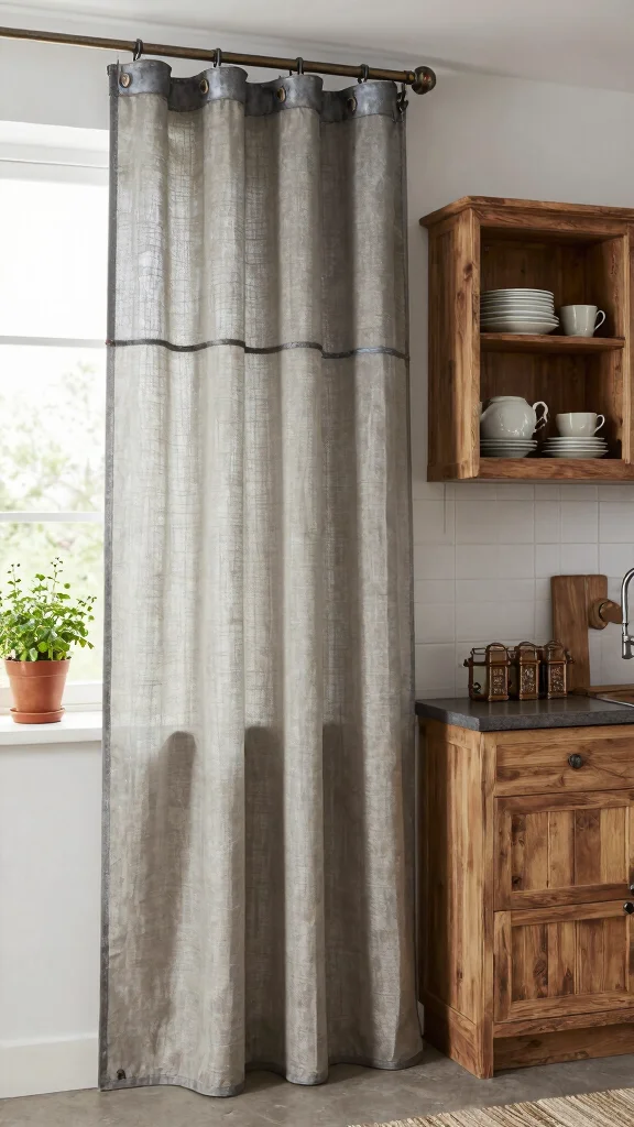 Fun fact: Rustic metal curtains can be crafted from repurposed sheets or chains, turning old materials into modern window treatments with an industrial edge. They cut glare while adding texture, then soften with linen or cotton drapes for a cozy farmhouse finish.