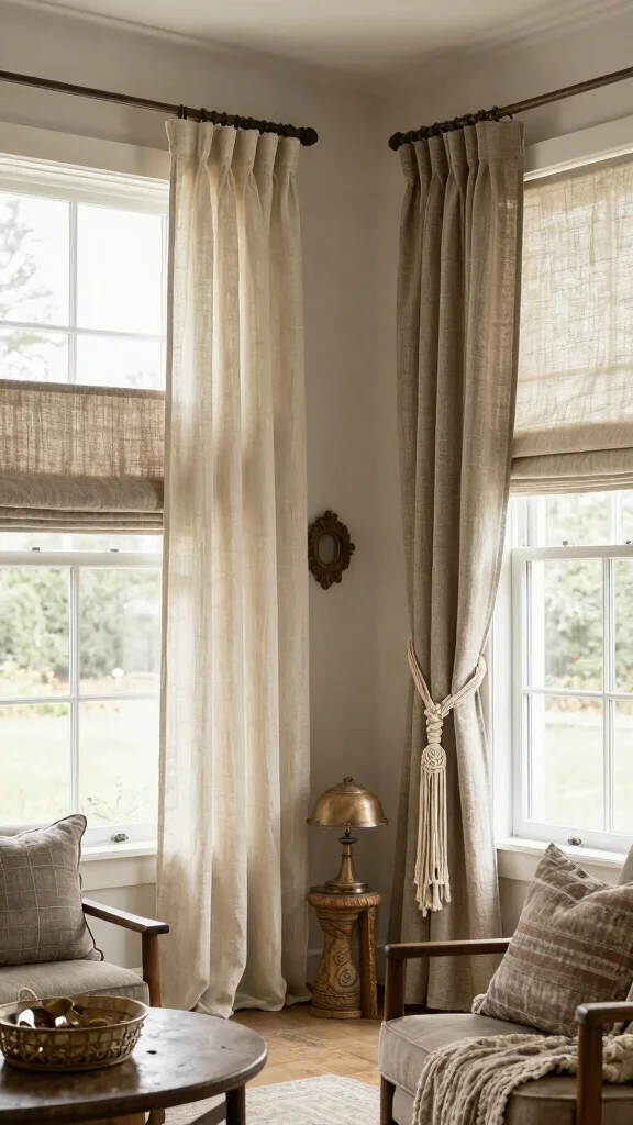 Soft linen drapes are my go-to for window treatments rustic charm. They filter daylight with a gentle touch, making mornings feel calm. Pair them with a rustic wooden rod, and your space instantly feels open, cozy, and inviting.
