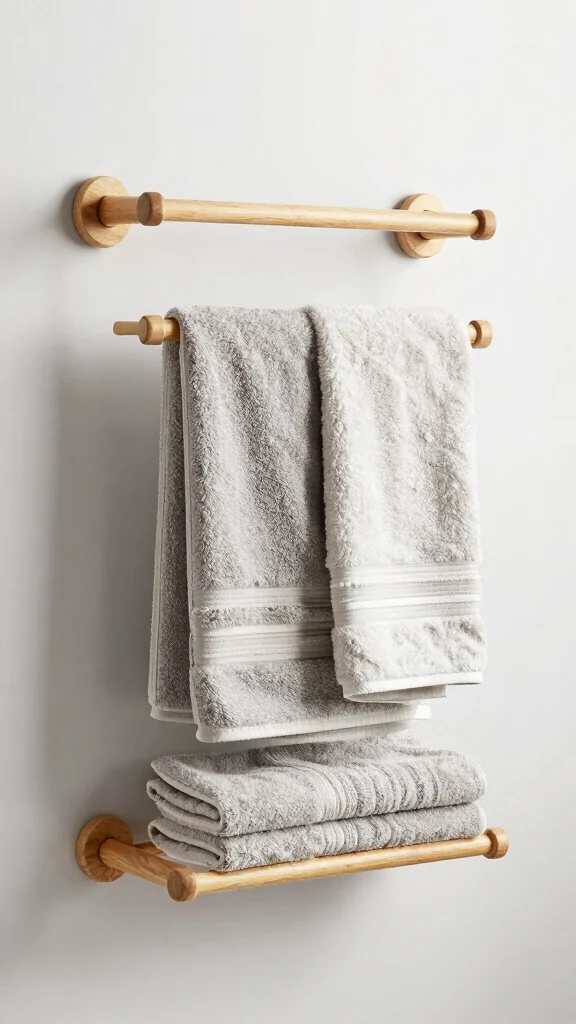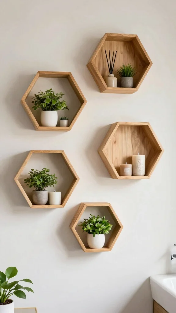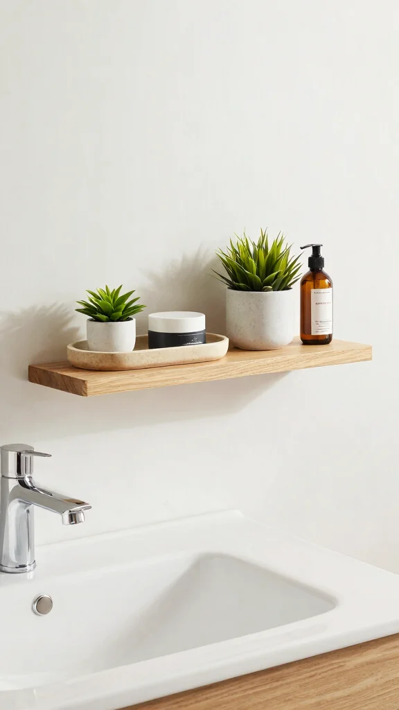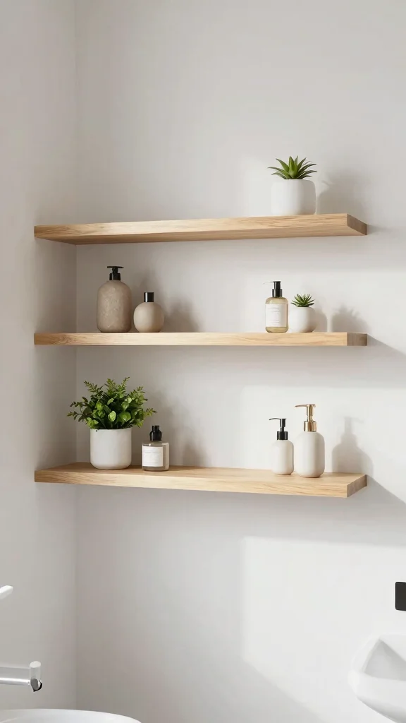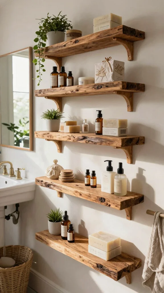 Minimalist wooden shelves bring a sleek, modern aesthetic to your bathroom. Opt for simple designs with clean lines and natural finishes that create a calming environment. These shelves can serve as a backdrop for carefully curated items, keeping the space neat and uncluttered.