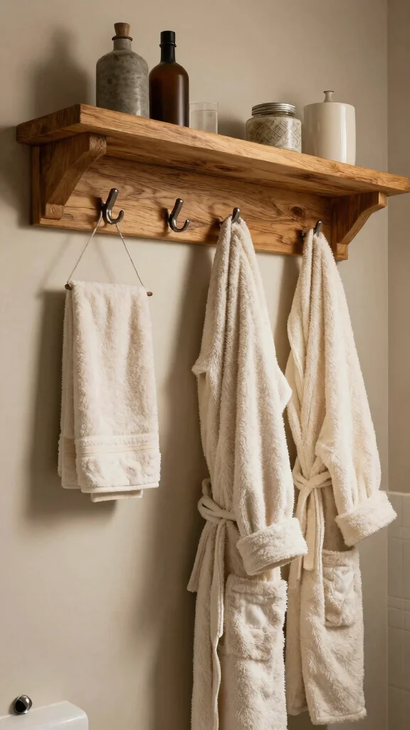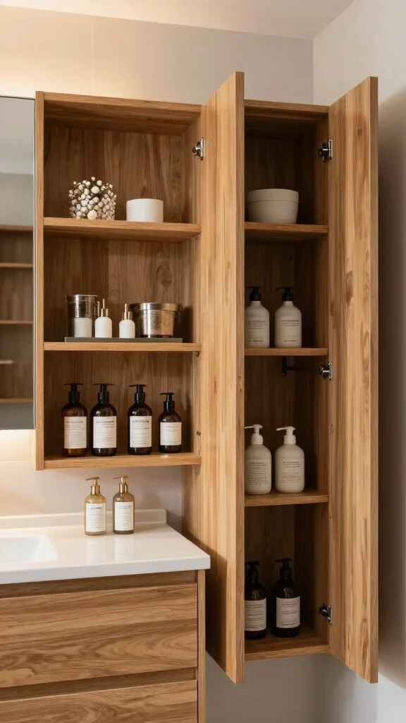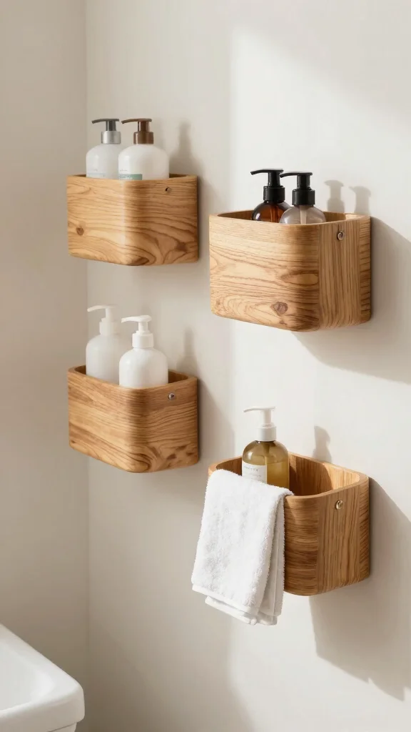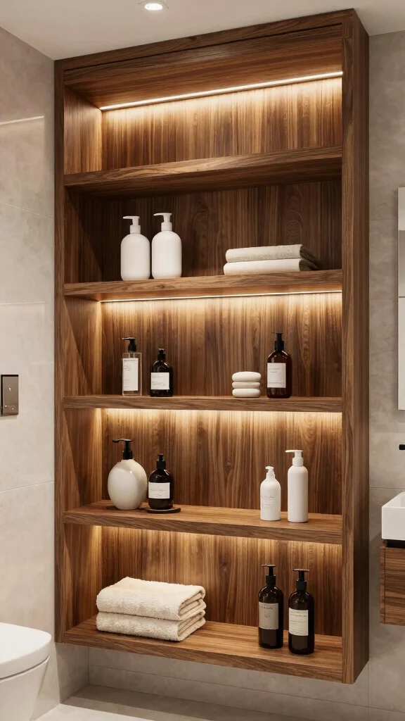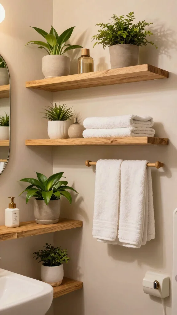 This approach not only optimizes space but also enhances your bathroom’s visual appeal with warm, natural textures.