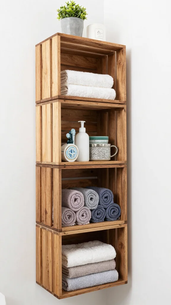 Repurposing wooden crates into shelves isn’t just chic—it’s budget-smart for wood bathroom shelves. Stack, mount, or paint to match your bath decor, then use every crate to showcase towels, plants, and essentials with rustic flair.