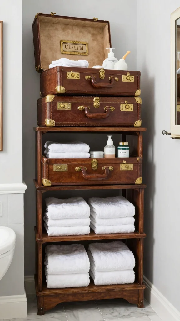 For a quirky twist on bathroom decor, vintage wooden suitcases can be repurposed as unique shelves. This creative idea adds character and nostalgia to your space while providing functional storage for towels or toiletries. Open the suitcases to reveal their contents, showcasing them as decorative pieces.