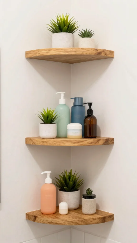 Utilize these shelves to store extra toiletries or decorative baskets, bringing both functionality and warmth to your bathroom. For a budget-friendly option, consider DIY corner shelves using reclaimed wood or pre-made brackets.