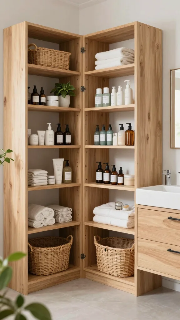 Use a mix of open shelves and baskets to hide toiletries while keeping daily items accessible. Consider corner shelves to use hard-to-reach corners and a slim over-the-toilet unit for towels and essentials. Group items by function to support bathroom organization ideas and combine with clear containers for easy visibility. Finish with a consistent wood tone to maintain the warm, natural feel of the room.